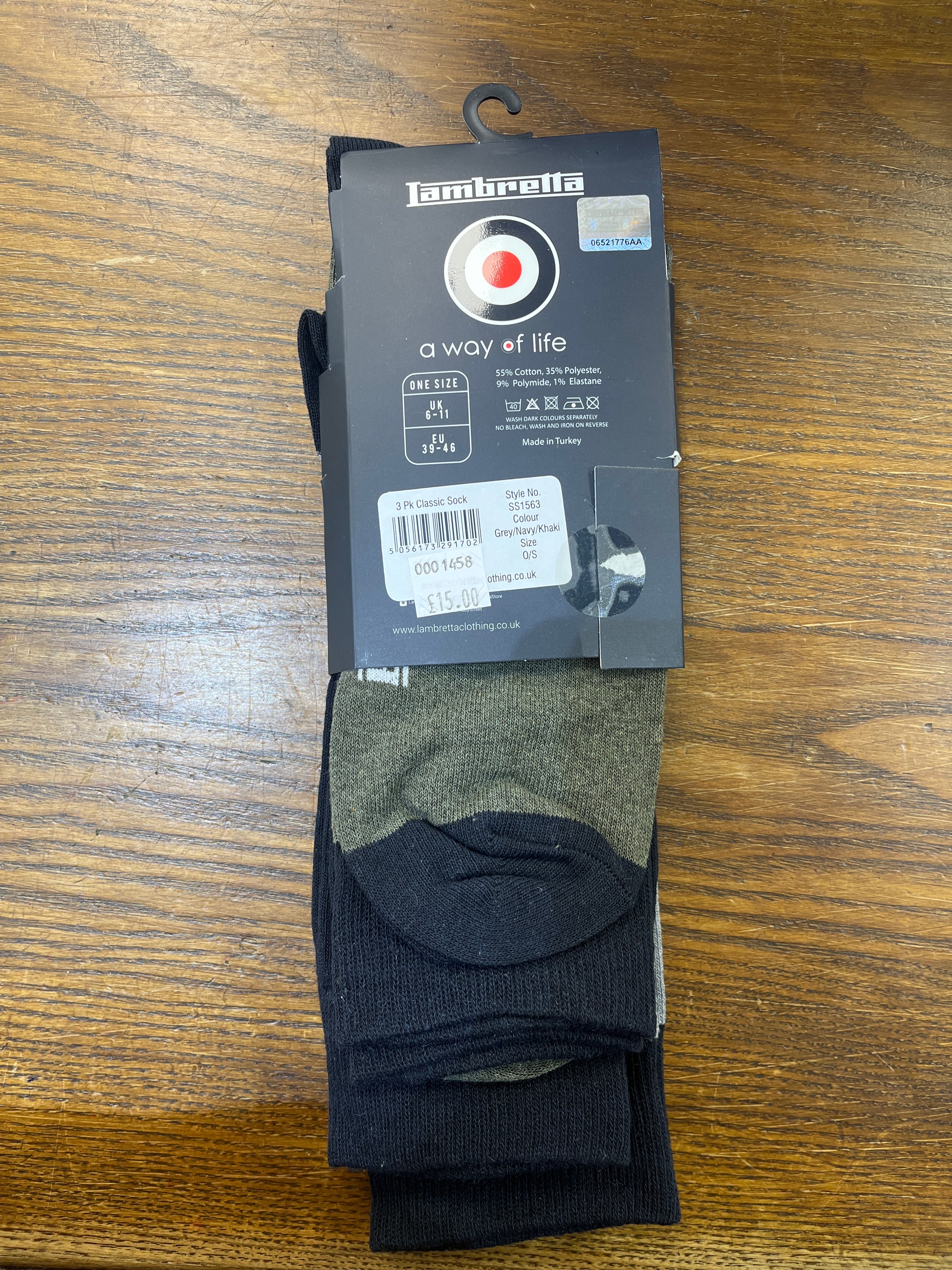 Lambretta 3 Pack Paisley Socks Grey/Navy/Khaki 3 Pack Paisley Socks-Target embroidery-1x Paisley pattern -1x Stripe pattern-1x Solid colour with logo-One...