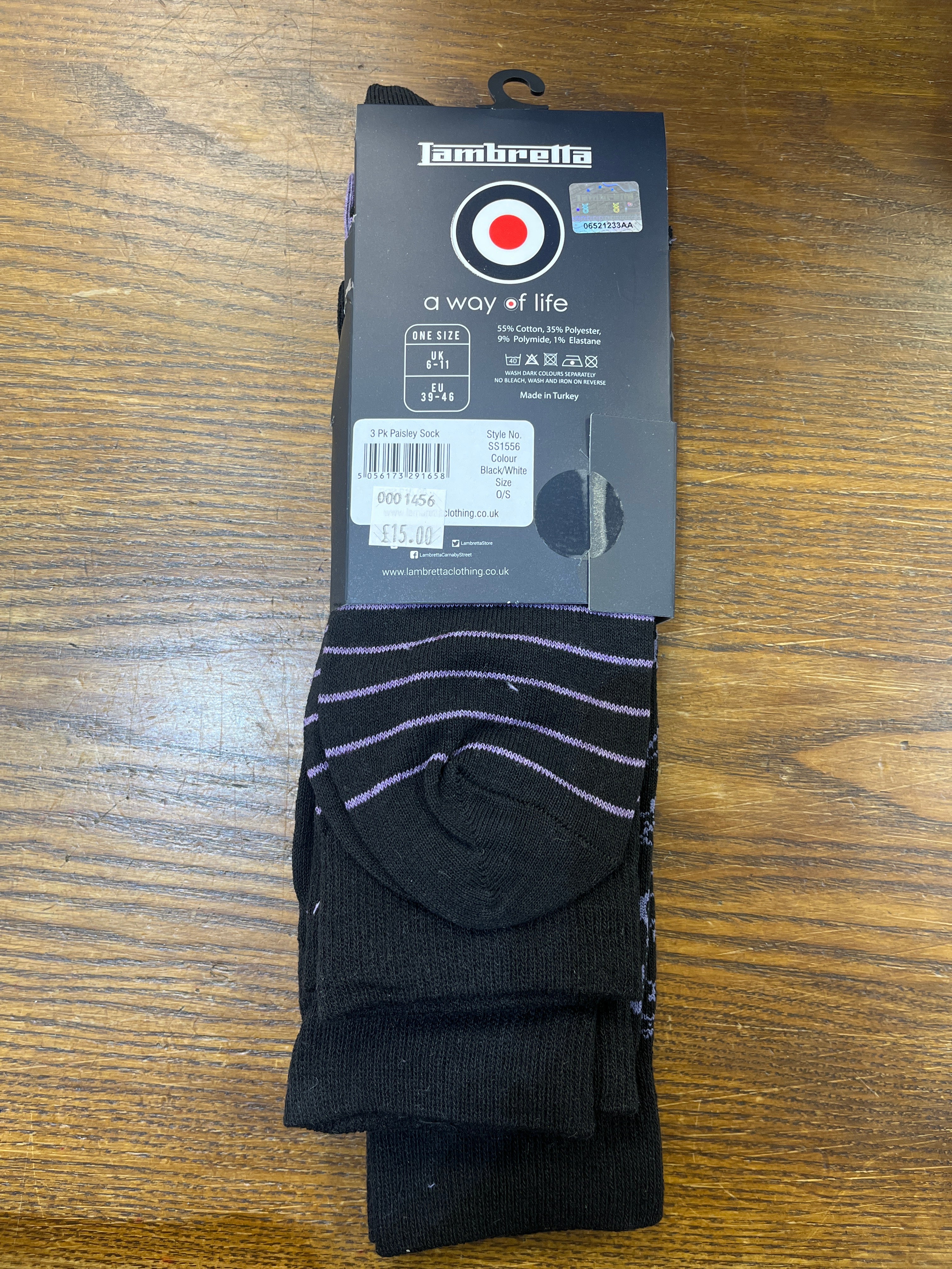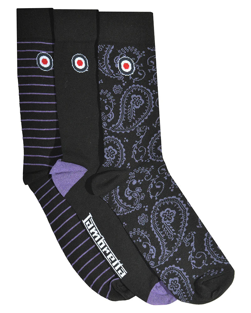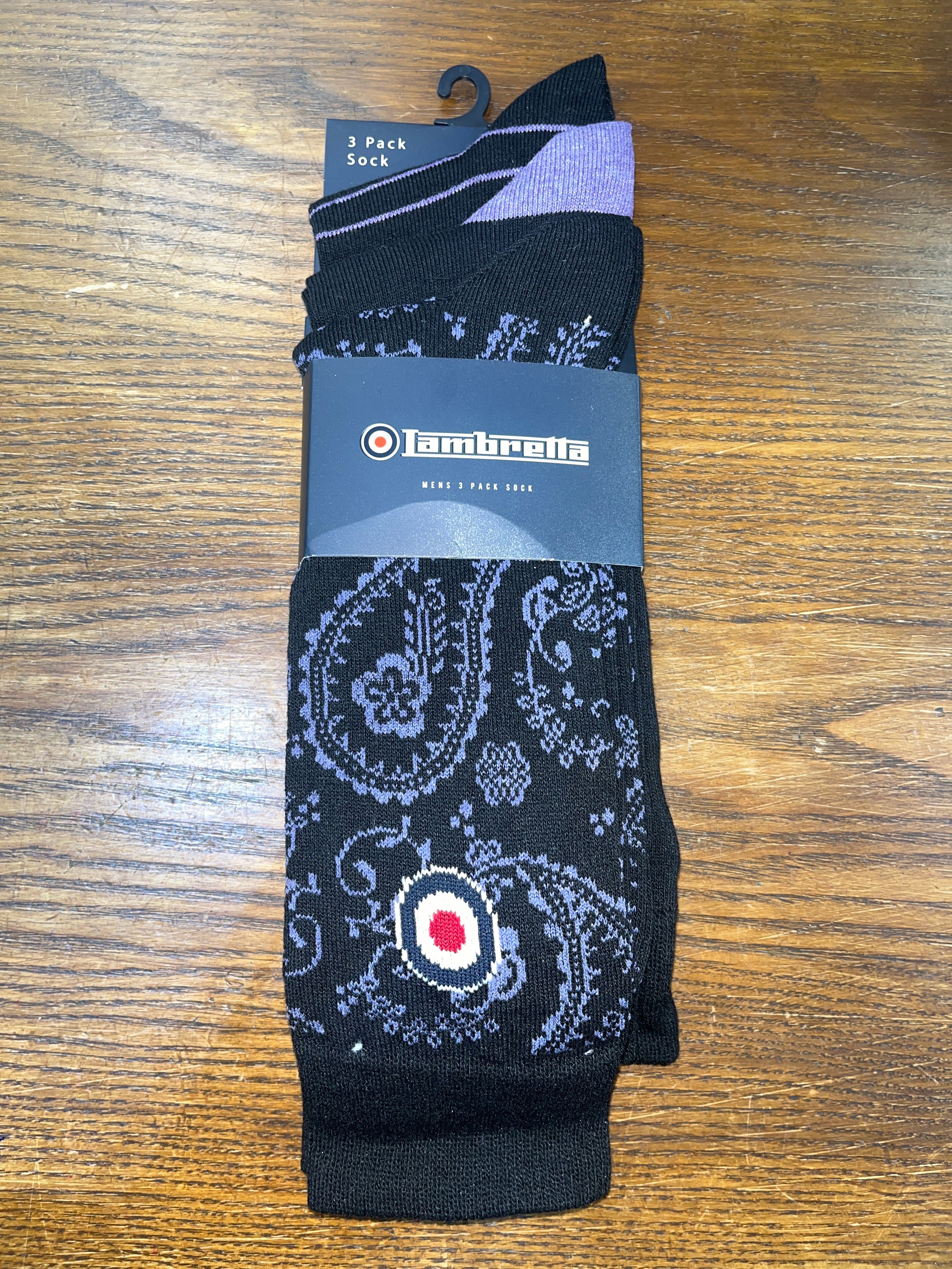 Lambretta 3 Pack Paisley Socks Black/Wine 3 Pack Paisley Socks-Target embroidery-1x Paisley pattern -1x Stripe pattern-1x Solid colour with logo-One...