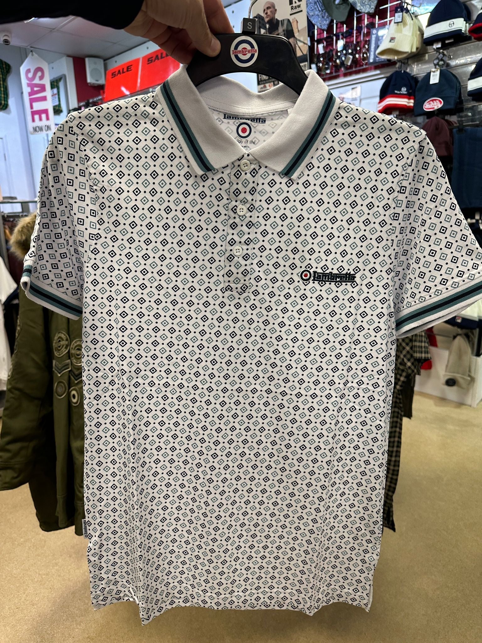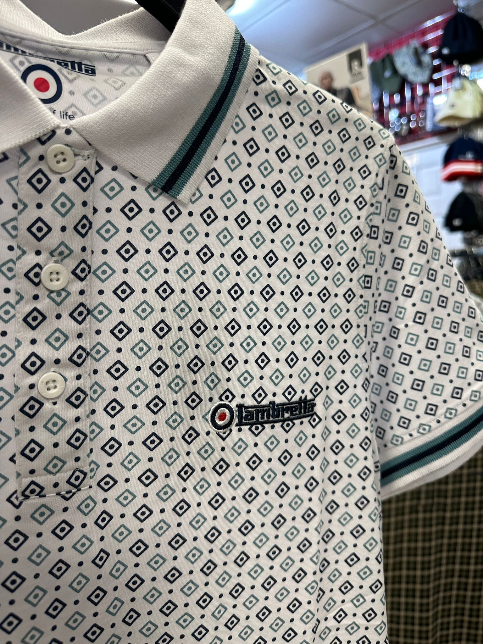 Lambretta GEO AOP Polo White/Navy/Smoke Blue -All over geometric print -Tipped collar and sleeve-Target embroidery to chest-Sleeve embroidery-3 button placket-Woven...