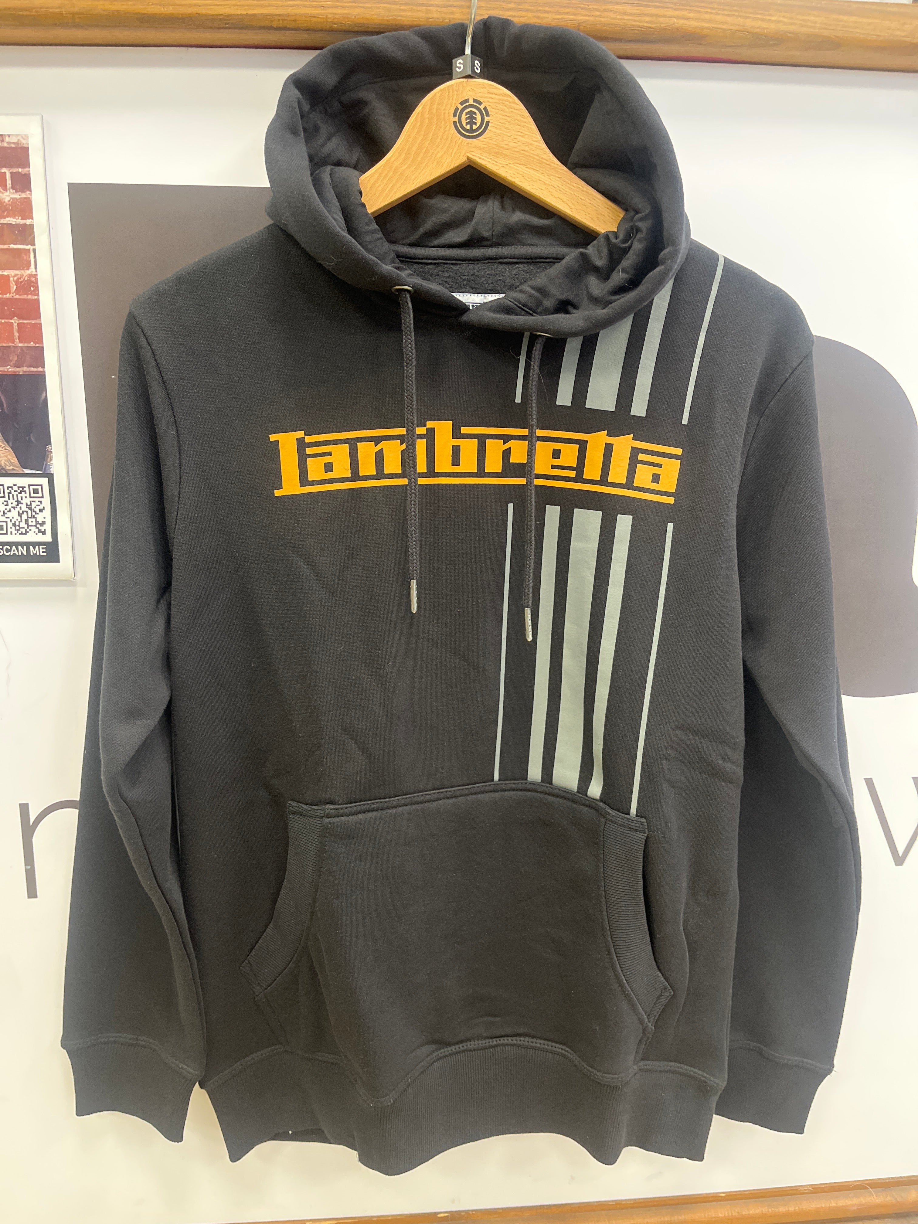Lambretta Stripe Hoodie Black -Striped chest print-Hooded sweat-Loopback fabric-Kangaroo pocket-Ribbed cuffs and hem-70% cotton, 30% polyester Made from loopback fabric...