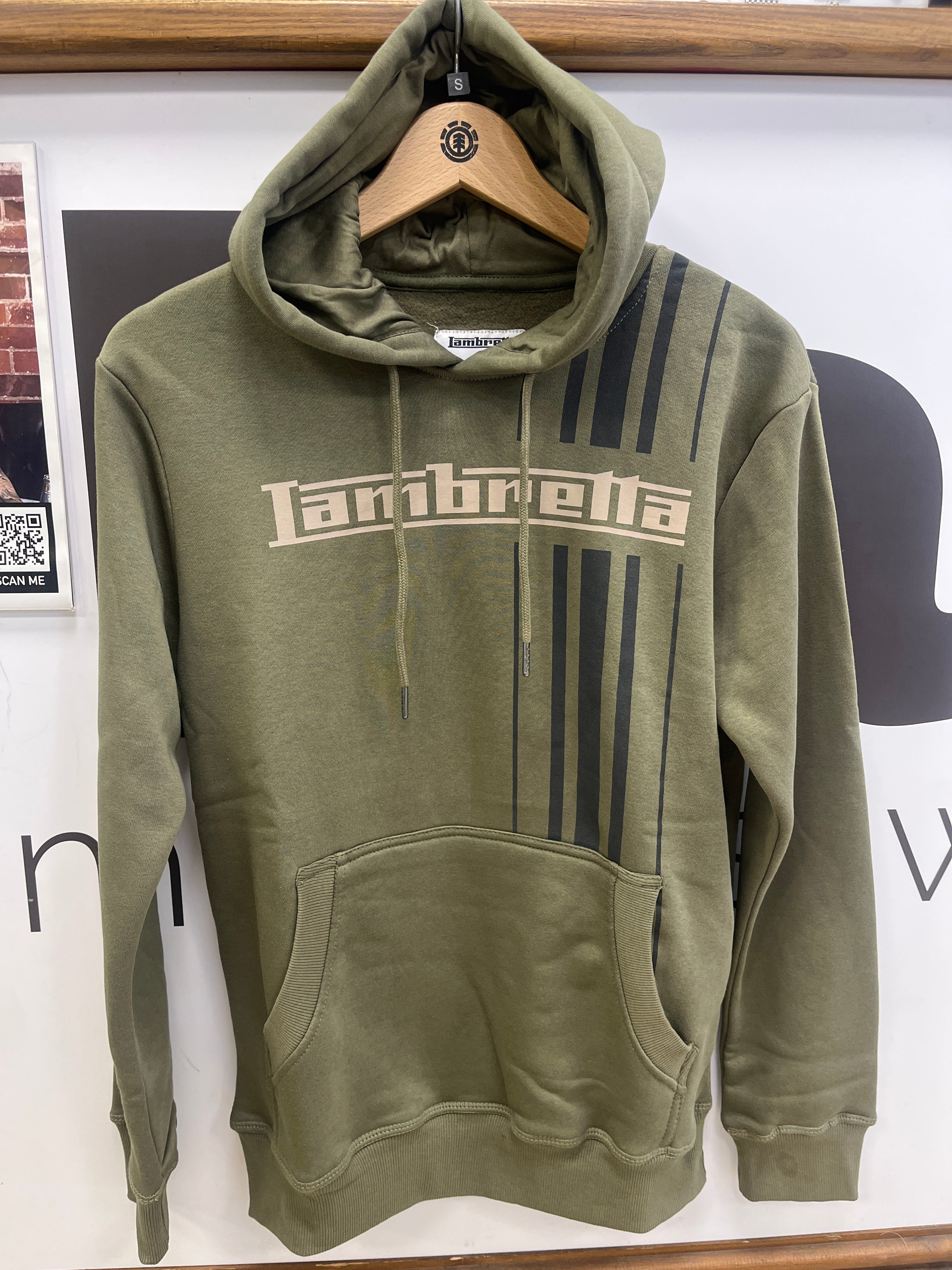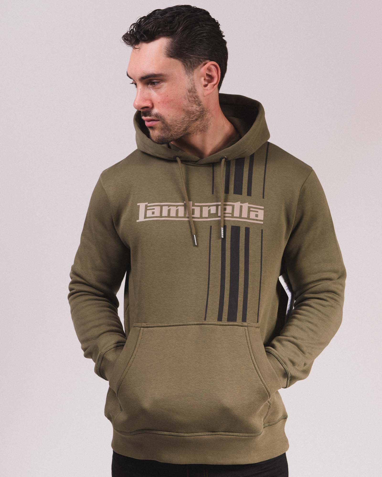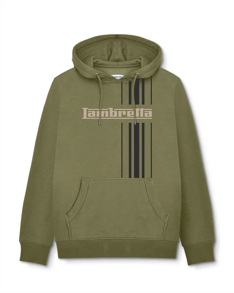 Lambretta Stripe Hoodie Khaki -Striped chest print-Hooded sweat-Loopback fabric-Kangaroo pocket-Ribbed cuffs and hem-70% cotton, 30% polyester Made from loopback fabric...
