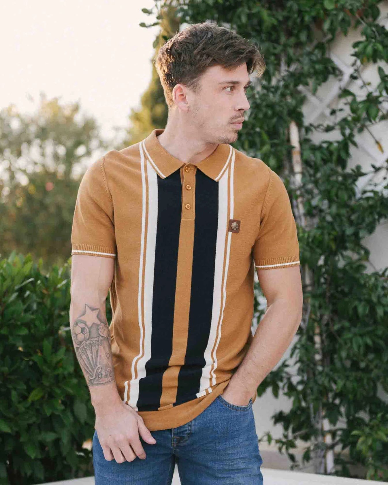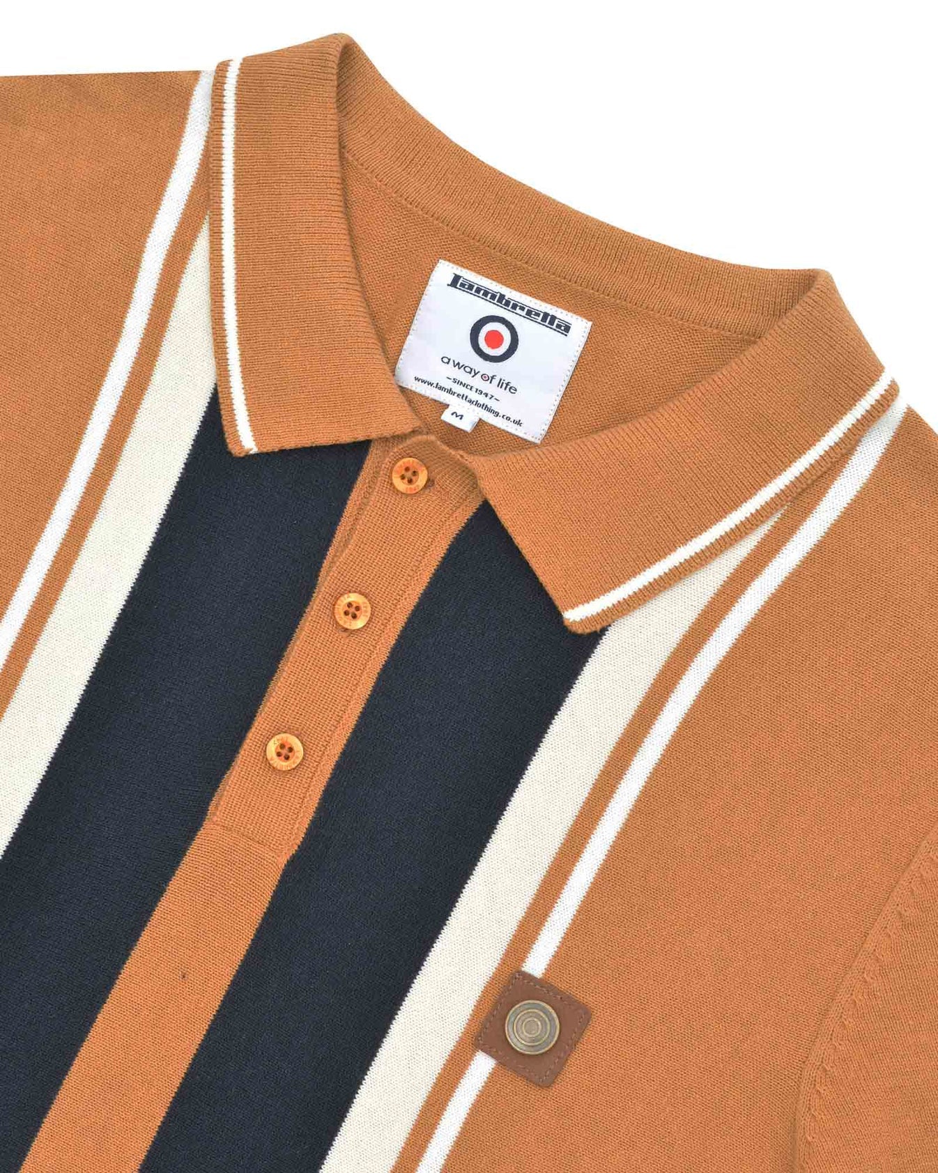 Lambretta Greco Striped SS Knit Polo Tobacco Tan -Contrast colour stripes-Fine gauge polo-Short sleeve-Knitted polo-3 button placket-Premium chest branding-Ribbed cuffs...
