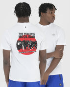 Peaceful Hooligan The Footy Factory Tee White Iconic film poster inspired back print Discreet Outline Dove print on the left...