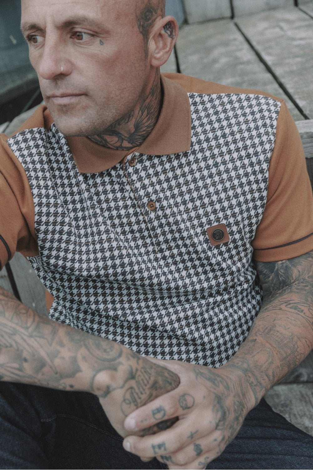 TROJAN Houndstooth Panel Polo TR/9020 Tan Heavy cotton interlock polo Houndstooth jacquard front panel Two button placket Piping on cuffs...
