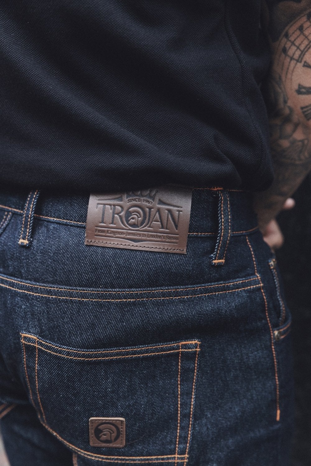 • Leather Trojan patch on waistband with embossed leather badge detail to pocket.